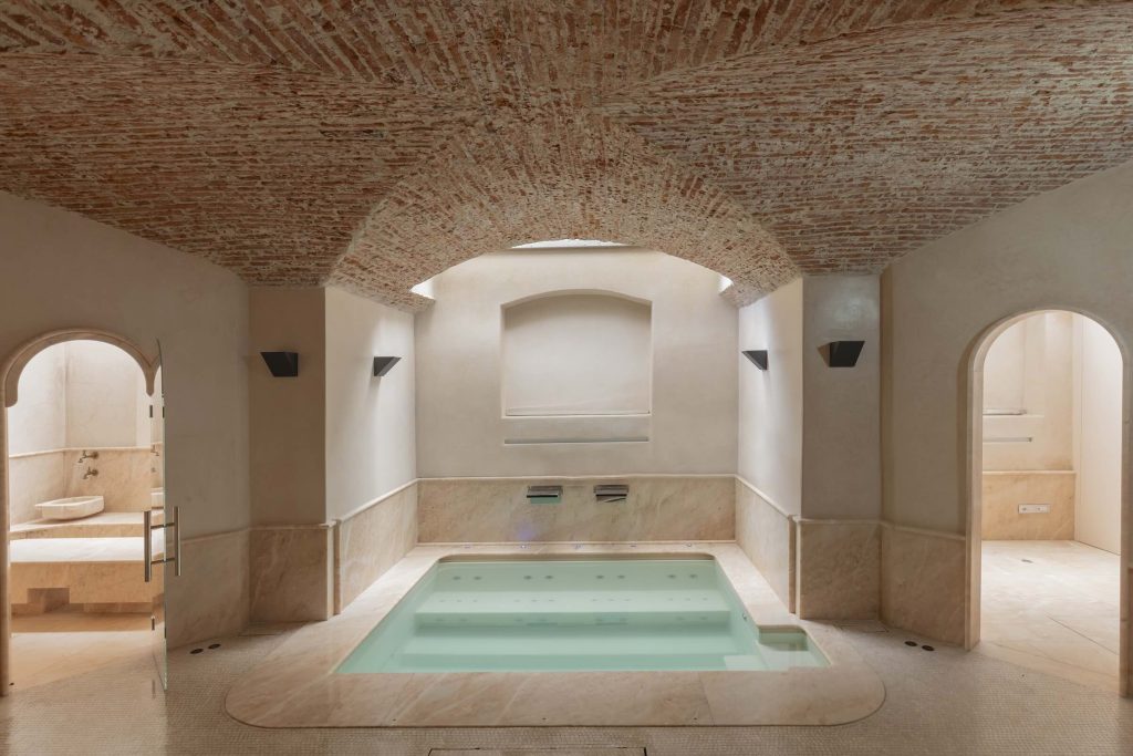During our visit, yes. Not a single other soul was seen in the vicinity of the split-level, cabana-flanked outdoor infinity pool, found via a short walk down lichen-pocked steps through those enchanting gardens. But—as mentioned above—the big news from this property is the Aquae Vitali Spa, which opened in the summer. A seductive, subterranean space with a Greco-Roman feel to it, set within the original villa’s greenhouse and accessed by a pleasant stroll further down that wisteria-filled gradient in the direction of Florence, it can be booked out for an hour of couple or family time.