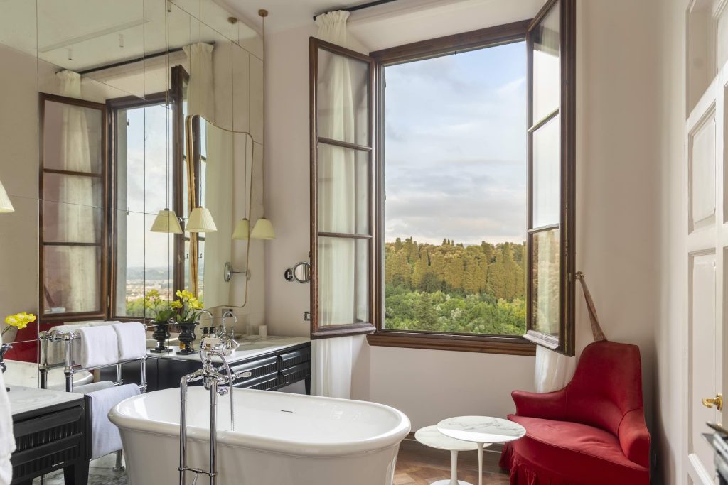 The Dalì Suite nods at the surrealist Spanish master’s aesthetic (he stayed here once) but not too overtly. The Grand Greenhouse Suite is a two-bedroom retreat, with floor-to-ceiling glass walls, in which guests are immersed in Il Salviatino’s gardens. But for something to literally write home about, consider the Presidential Suite, a grand statement space whose wow factor is bolstered by an impressive marble fireplace and original oil canvases by Dutch Golden Age landscape painter Gabriel van der Leeuw.