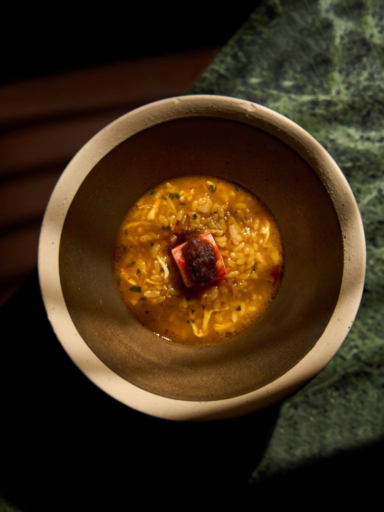 On the menu: a lineup of diverse dishes in which rice shines as the star, in forms simmered, stewed, steamed, fried, crisped, puffed, roasted, creamed, and fermented. Balbi threads harmonious connection between the ingredients, allowing for a sharp, focused, and intentional flavour experience, where each component has its rightful place. Begin with a trio of bocaditos—“little bites”—consisting of a crispy rice sphere with crab and a crown of caviar, a rice-paper roll with a filling of prawn and coriander, and an “onigiri” with marinated tuna, smoked soy, and chives.