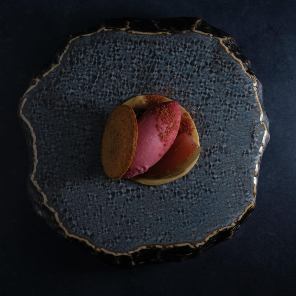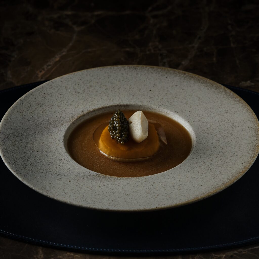 Thanks to a renewal of the interiors, the space itself has been refreshed with a new, elegant design. Under the muted lighting, deep navy and grey tones are set against the glint of an ochre marble counter and earth-toned plates. Retaining its forerunner’s intimate ambience, the restaurant makes for a sumptuously cushy spot to become acquainted with top-shelf new Nordic cuisine.