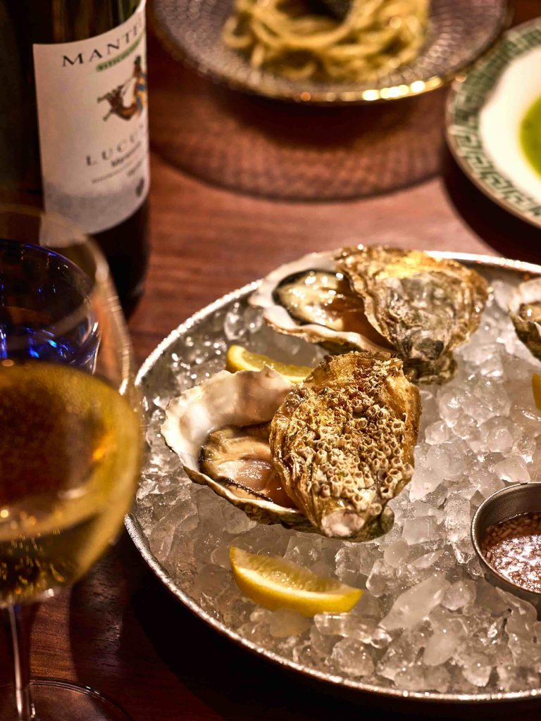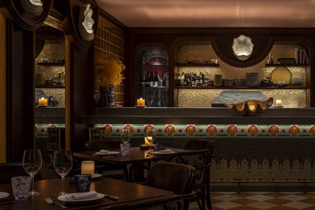 Salon des Refusés’ atmosphere and interiors, too, defy stereotypical characterisation. Marinelli might even say that being contrarian is the cornerstone of this new restaurant concept: “As the Salon des Refusés, we were always going to be different.” Designer Melissa Collison was instrumental in creating a space that communicated that divergence. Collison and Marinelli wanted to capture the essence of coastal life, and the result is a dramatic, nostalgic dining room that feels like a moment frozen in history, a snapshot captured in amber. Kitchen notes are liberally scribbled on the cocoa-coloured wall tiles, checkered marble flooring and mosaics evoke Art Deco inspirations, and everywhere you turn, the seashell motif is embedded. Marinelli shares that “the seaside tones are there, you have dark wood and plush velvet, [and] the idea is to create a warm and intimate space with a focus on connection and hospitality.”