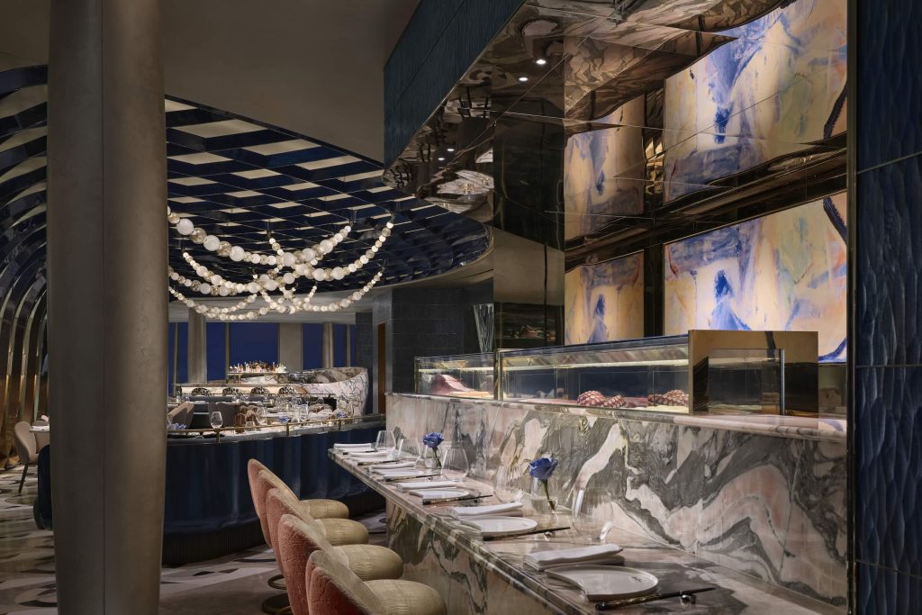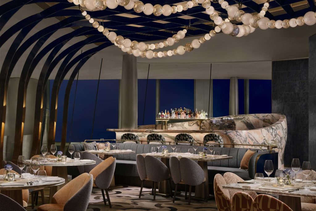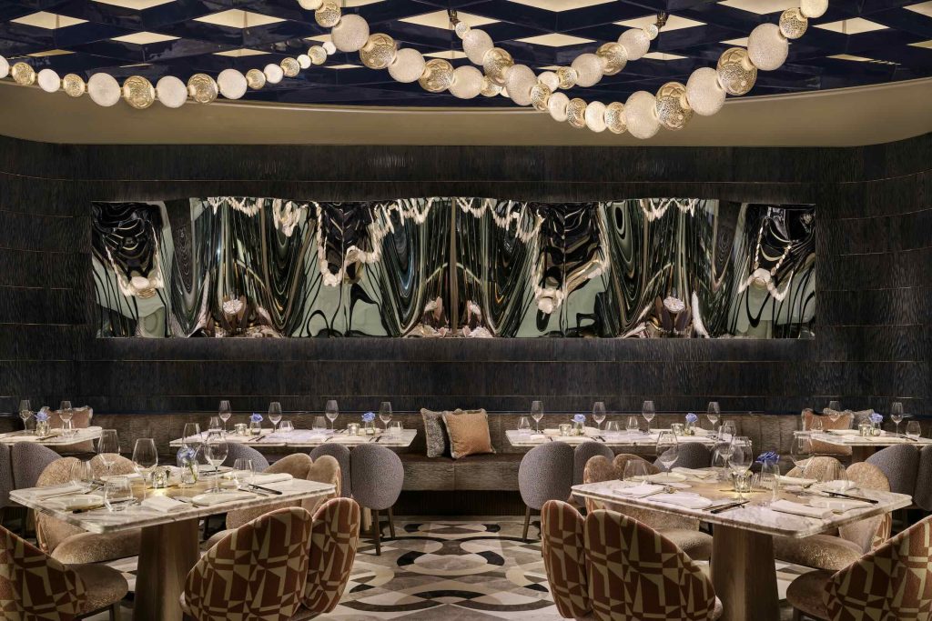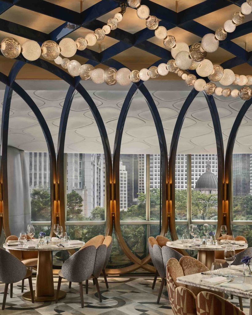 “Our design DNA directly draws inspiration from […] The Henderson,” Wang tells Robb Report Hong Kong as he explains how his team used parametric design tools to create the restaurant’s organic interior forms. “For instance, the ceiling’s intricate lattice features individually unique panels, reflecting the tower’s own innovative structural language. […] Elements like the undulating mirrors are a direct homage, mimicking the iconic curving facade of the building itself.” Petal-like shapes throughout the custom-designed furniture pieces echo The Henderson’s Hong Kong orchid concept.