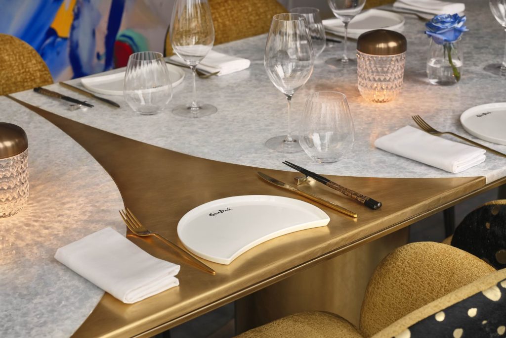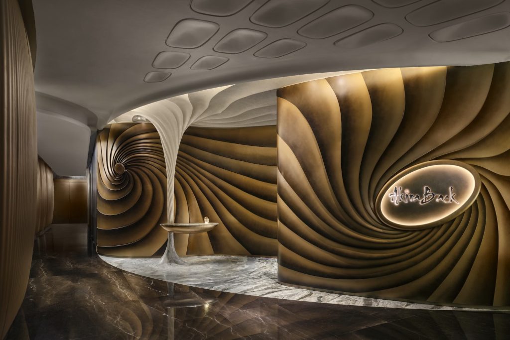 Finding a home within a design-forward landmark penned by none other than Zaha Hadid Architects meant the restaurant interiors had to be appropriately striking. AB Concept rose to the occasion, mapping out a space that matches the dynamism and sophistication of Back’s genre-breaking cuisine, while respectfully balancing the building’s original design concept. A soft energy permeates the dining room, influencing shape, material, and colour—a decision that “was absolutely intentional,” shares AB Concept associate Rex Wang. “Our primary goal was to create a chic and serene dining oasis that stands in stark contrast to its setting within an office tower.” Standing in the Akira Back restaurant, the workplace atmosphere is easily forgotten. Gentle curves, undulating lines, and spherical elements evoke a sense of femininity, with dark swathes of colour and finishing standing in contrast to bring drama into the picture.