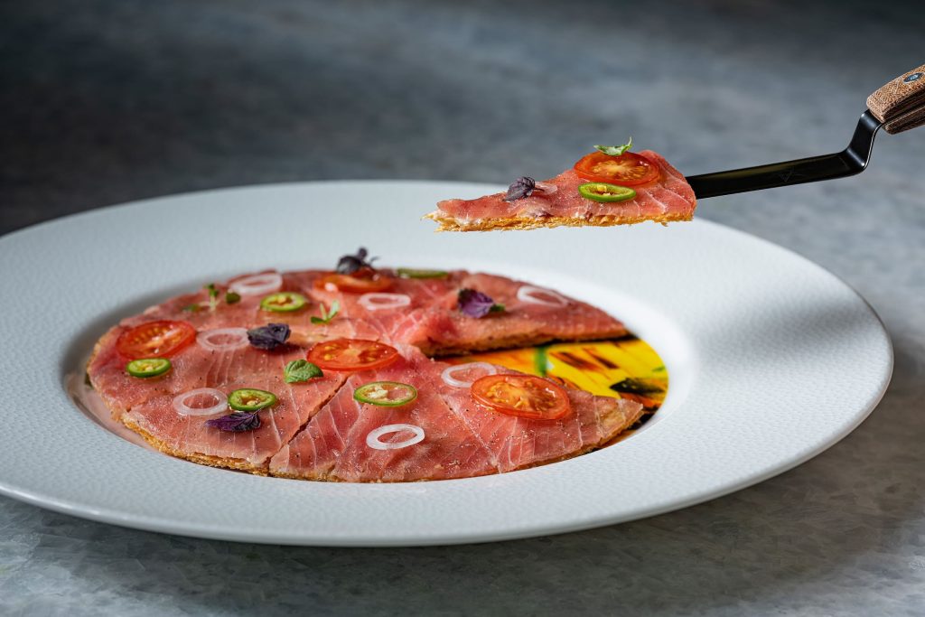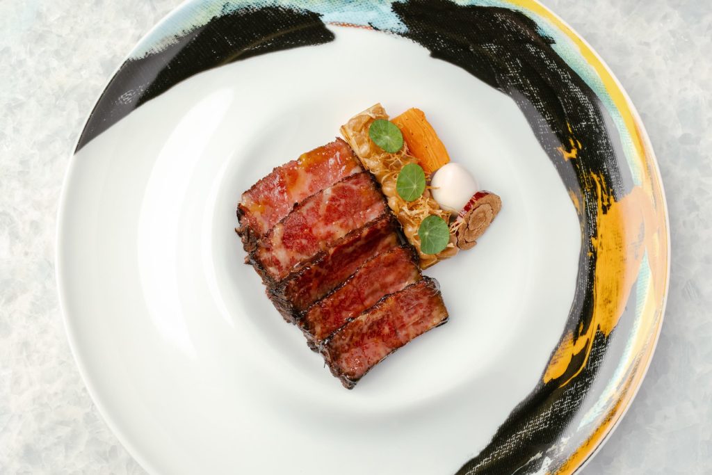 As Back dips his toes into a new market with this latest opening—this is, after all, still terra incognita to the chef in terms of audience, reception, and preferences—the restaurant’s initial launch menu is safely puzzled together from the tried-and-tested, the well-received, and the best-selling. Hong Kong diners, those familiar and unfamiliar with the quintessential Akira Back table, can encounter his culinary concept in a nutshell through signatures popularised at his other restaurants, such as the delicate AB cucumber salad, painstakingly constructed by folding slivers of the vegetable into a dome-like shape reminiscent of playground climbers. Back refers to his cuisine as Korean-Japanese with American flair—a reflection of his own personal background, from Seoul to Aspen to the world—and the lines between the food cultures certainly blur when you peruse the menu. It’s “comfortable food, it looks simple, but it takes a long time to make,” Back says, and his compressed watermelon carpaccio is one such creation, where first impressions belie the dish’s true nature. What appear to be slices of roasted red bell peppers are, in fact, neat piles of watermelon marinated in paprika vinaigrette for 24 hours, crumbled over with feta and candied walnuts. Back’s meticulous preparation provides a positively mind-boggling dish with a surprising twist.